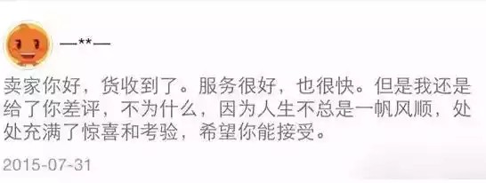 开淘宝店首先得有一个强壮的大心脏,要不然会被买家气死。前不久,我一朋友开淘宝店的,收到一评论:老板,你家的东西特别好,快递也特别快,服务也是前所未见的好。可是今天我心情不好,就想给个差评。。。我朋友瞬间晕倒厕所!能不能不要这么搞?当淘宝卖家很辛苦好不好?
