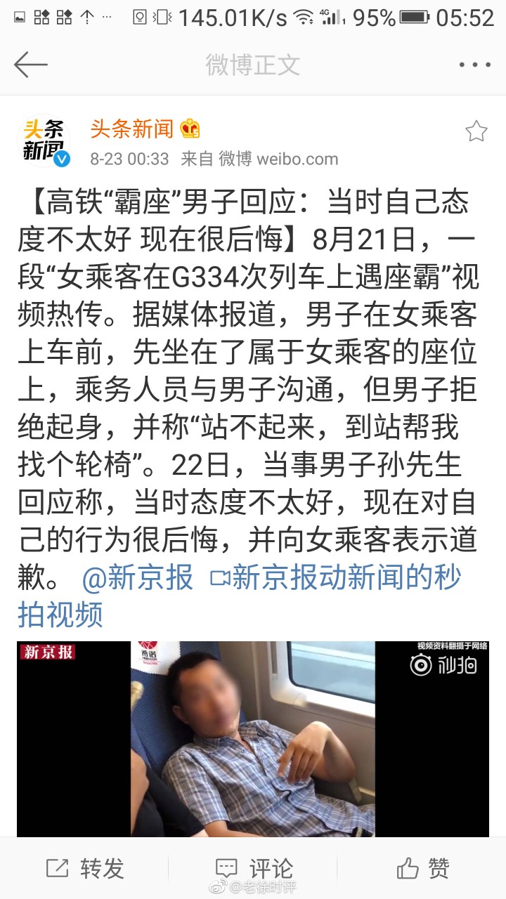 高铁“霸座”男的视频激起了民愤,22日当事男子孙先生回应称,当时态度不太好,现在对自己的行为很后悔,并向女乘客表示道歉。